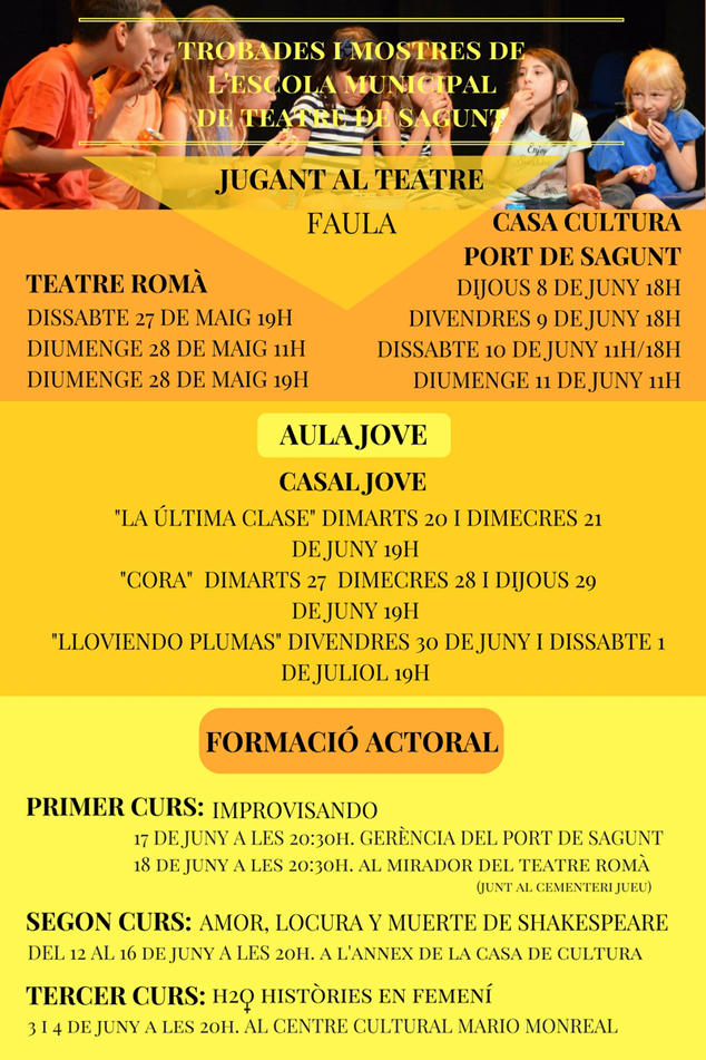 Las jornadas Faula. Jugant al Teatre darán comienzo a estos encuentros de teatro con representaciones en el Teatro Romano el sábado 27 de mayo a las 19 horas. El tema principal de esta muestra infantil girará en torno a la protección del medio ambiente y el planeta. Las representaciones continuarán el domingo 28 de mayo a las 11 y a las 19 horas en el Teatro Romano y del jueves 8 al domingo 11 de junio, a las 18 horas los tres primeros días y a las 11 horas el fin de semana, en la Casa de Cultura de Puerto de Sagunto.