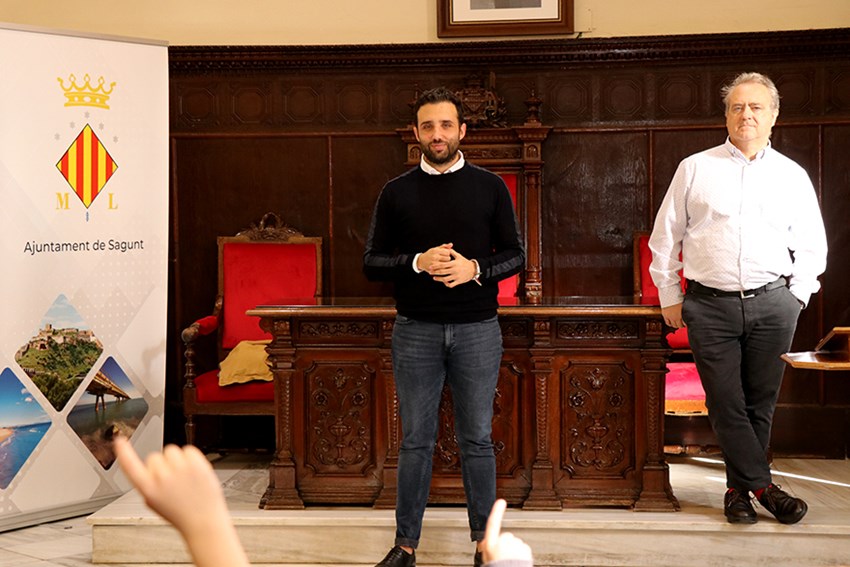 El alcalde de Sagunto, Darío Moreno, y el concejal delegado de Educación, Josep Manuel Tarazona, han recibido este jueves la visita de un grupo de escolares de segundo curso de Primaria del CEIP Montíber (antiguo Villar Palasí).