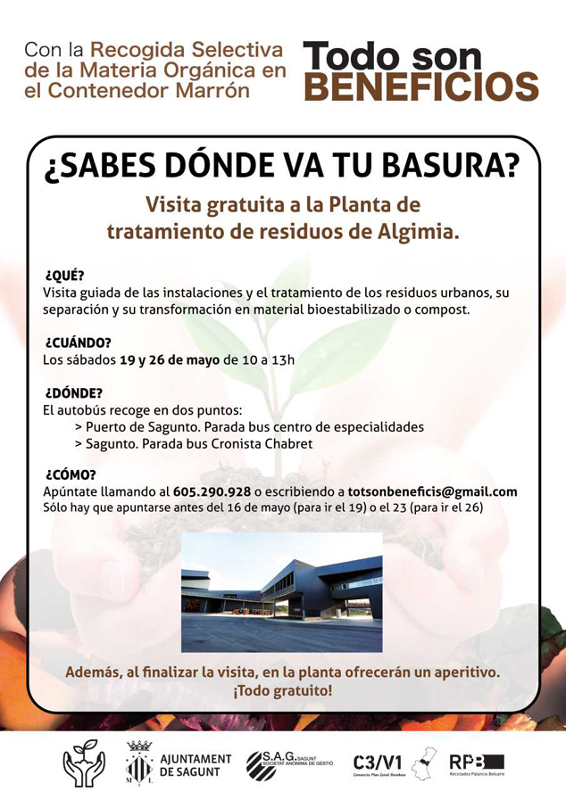 La campaña Todo son beneficios para fomentar la recogida selectiva de materia orgánica, organiza dos visitas guiadas a las instalaciones de la planta de Algimia los días 19 y 26 de mayo de 10.00 a 13.00 horas, con el objetivo de que la población sepa dónde va y qué proceso se realiza con la basura que tira cada uno.
