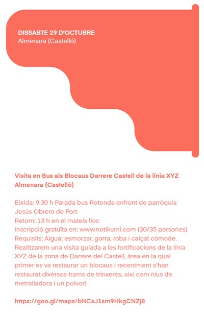 En esta excursión se hará una visita guiada a los escenarios de la Guerra Civil situados detrás del castillo de Almenara y que formaban parte de la ‘Línea XYZ’. En esta zona se ha restaurado un blocao, varios tramos de trincheras, nidos de ametralladora y un polvorín. Para el desplazamiento, la Concejalía de Memoria Histórica y Democrática dispondrá un autobús con salida desde la parada de la rotonda frente a la parroquia de Jesús Obrero de Puerto de Sagunto y con regreso al mismo lugar sobre las 13:00 horas. La inscripción a esta actividad es gratuita y se debe formalizar a través de la página web www.notikumi.com, indicando ‘Almenara’ en el buscador, o accediendo directamente a través del enlace. Se recomienda llevar agua, almuerzo, gorra y ropa y calzado cómodo.