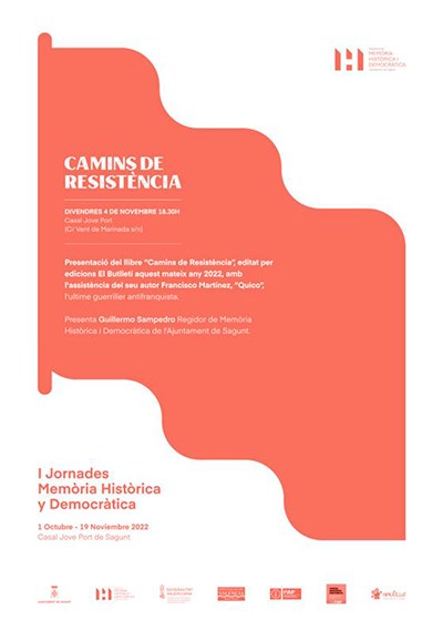 Por otra parte, la semana próxima, concretamente el viernes 4 de noviembre, a las 18:30 horas, en el Casal Jove de Puerto de Sagunto tendrá lugar la presentación del libro Caminos de resistencia (Ediciones El Boletín) por parte de su autor, Francisco Martínez Quico, uno de los últimos guerrilleros antifranquistas que aún viven, en que cuenta su historia. El concejal delegado de Memoria Histórica y Democrática, Guillermo Sampedro, conducirá el acto.