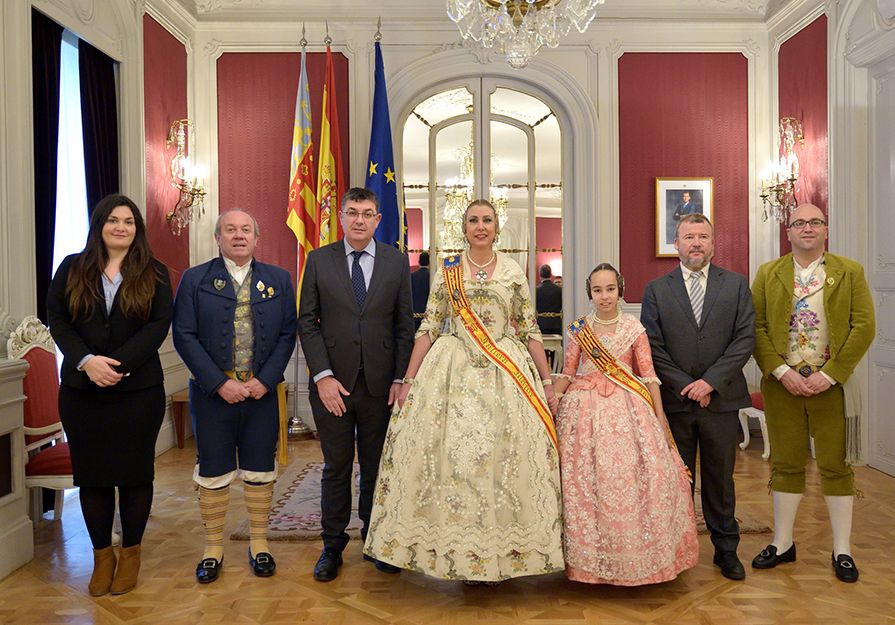 Posteriormente, los representantes del consistorio y la comitiva fallera visitaron las Cortes Valencianas donde fueron recibidos, en la Sala de los Espejos del Palau dels Borja, por su presidente, Enric Morera. En esta visita, las Falleras Mayores de la Federación Junta Fallera de Sagunto fueron obsequiadas con una tablilla que reproduce el blasón oficial de la familia fundadora de este palacio además de poder realizar una visita guiada por las instalaciones de las Cortes. Se trata de un grupo escultórico formado por un maestro y un aprendiz y el antiguo edificio de la Escuela de Aprendices