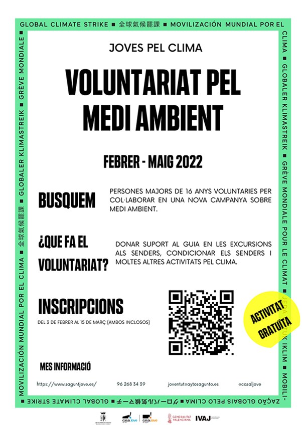 La Concejalía de Juventud e Infancia del Ayuntamiento de Sagunto ha abierto las inscripciones para el programa de voluntariado por el clima a todas las personas mayores de 16 años que deseen participar en la iniciativa.