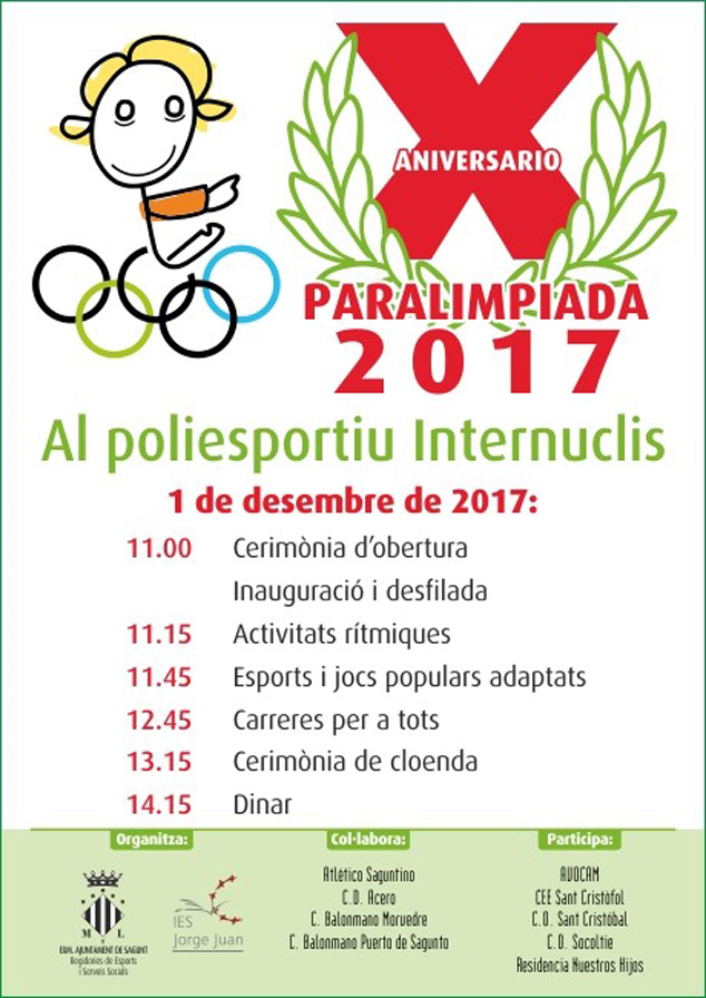 El próximo viernes, 1 de diciembre, tendrá lugar la X Paralimpiada 2017 en el Polideportivo Municipal (internúcleos). El evento es una actividad organizada por el IES Jorge Juan y el departamento de Deportes del Ayuntamiento de Sagunto. La finalidad de esta paralimpiada es la de ofrecer una alternativa deportista a aquellas personas que tienen diversidad funcional y tienen dificultad a la hora de practicar deporte.