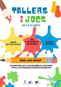 Por último, los talleres y juegos programados que están dirigidos a los y las jóvenes de entre 7 y 12 años se harán los jueves de 17.30 a 19.30 horas en el Casal Jove de Puerto de Sagunto desde el 11 de enero hasta el 28 de marzo.