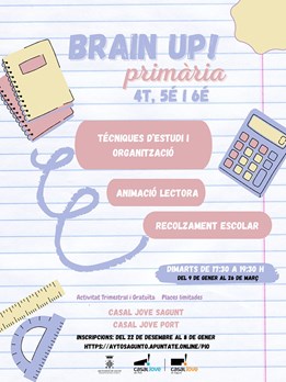 Por otro lado, el BRAIN UP! Primaria está destinado, en esta ocasión, al alumnado de cuarto, quinto y sexto de Primaria. La actividad se llevará a cabo los martes de 17.30 a 19.30 horas en los Casals Joves de Sagunto y Puerto de Sagunto desde el 9 de enero hasta el 26 de marzo. En esta actividad se aprenderán técnicas de estudio y organización del estudio, se animará a la lectura y se hará refuerzo escolar.