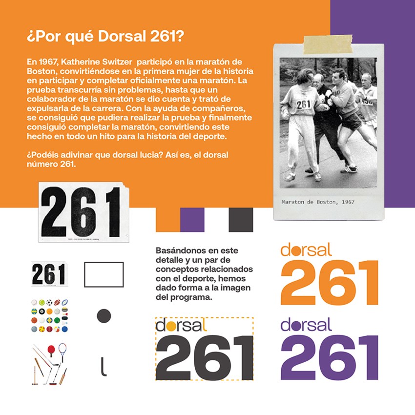El programa recibe el nombre de Dorsal 261 en honor a la atleta Katherine Switzer, quien en 1967, en Boston (EEUU), se enfrentó al machismo imperante y se convirtió en la primera mujer de la historia en completar una maratón, después de tener que sobreponerse a los intentos de uno de los colaboradores de la organización de la carrera por echarla fuera de la prueba, incluso a empujones. Switzer participó en la Maratón de Boston con el dorsal número 261.