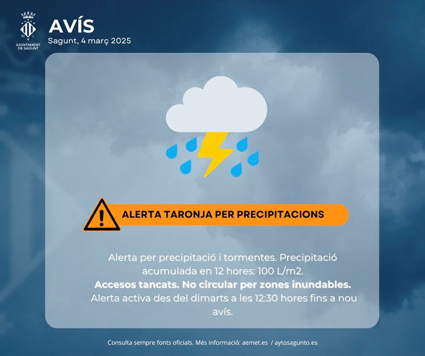 L'alerta per precipitacions a Sagunt i en tota la província de València s'ha elevat a nivell taronja (risc important) per part de 112 Comunitat Valenciana. A més, s'ha suspés el mercat exterior de Sagunt previst per a demà i esta vesprada es decidirà si es prolonga la suspensió de les classes, així com de les activitats esportives i extraescolars municipals.