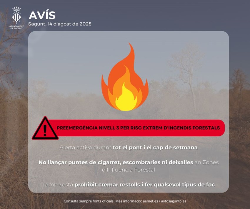 D'un altre costat, es manté el nivell 3 (perillositat extrema) de risc d'incendis segons el sistema PREVIFOC, amb la qual cosa convé extremar les precaucions en zones forestals i en un radi de 500 metres al voltant d'estes. Per descomptat, està prohibit encendre qualsevol tipus de foc, incloses les cremes que estigueren previstes i autoritzades abans que s'elevara la preemergència.