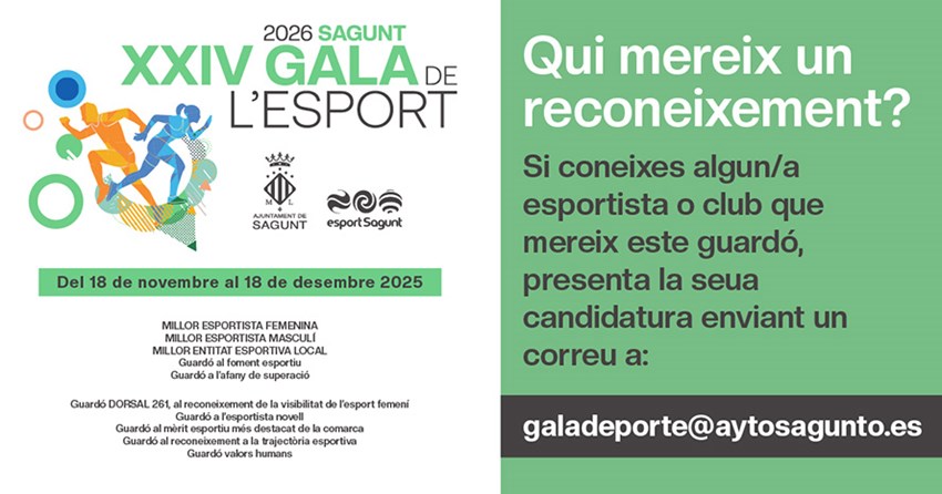 La regidoria d'Activitat Física, Salut i Esports ha obert el termini per a presentar candidatures als premis de la XXIV Gala de l'Esport, que se celebrarà el dijous 19 de febrer de 2026 a l'Auditori Joaquín Rodrigo. Les persones i/o entitats interessades podran presentar les seues candidatures fins al 18 de desembre de 2025.