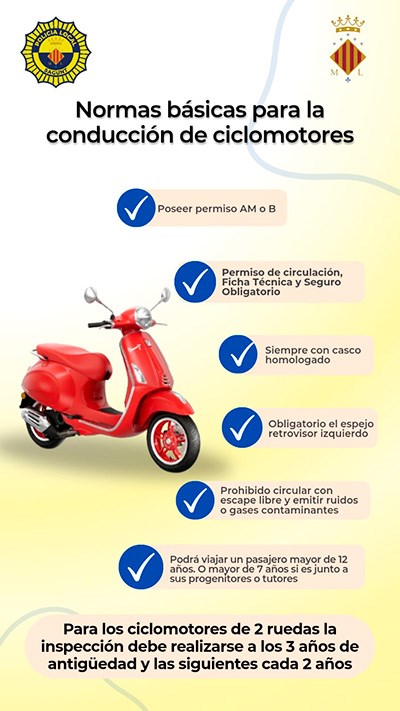 Les normes bàsiques per a la conducció de ciclomotors són: posseir el permís AM o B, tindre permís de circulació, fitxa tècnica i assegurança obligatòria, circular sempre amb casc homologat, ús obligatori del retrovisor esquerre, prohibit circular amb fuita lliure i emetre sorolls o gasos contaminants i la possibilitat de viatjar un passatger de 12 anys o major de 7 anys si és amb els seus progenitors o tutors. A més, es recorda que per als ciclomotors de dos rodes la inspecció ha de realitzar-se al cap de 3 anys d'antiguitat i les següents cada dos anys.