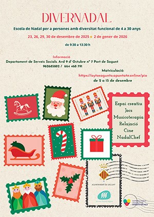 Per la seua banda, el departament de Serveis Socials ha programat un any més DiverNadal 25, el programa dirigit a les persones del municipi amb diversitat funcional que oferix activitats d'oci i temps lliure. En esta edició inclourà activitats artístiques, psicomotricitat fina i gruixuda, expressió corporal, taller d'ombres, musicoteràpia, curtmetratge, taller de cuina (tortell de Reis, amb la col·laboració de Tomás Martínez, de la pastisseria Chocomel) i eixides pel municipi (visita al Betlem, comerços locals, mercat ambulant nadalenc, etcètera).