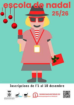 D’una altra banda, l'Escola de Nadal, organitzada pel departament de Joventut i Infància, conscient de la importància de dotar de contingut el temps lliure de la infància durant les vacances, es desenvoluparà al Casal Jove del Port de Sagunt i al CEIP José Romeu de Sagunt els dies 23, 26, 29 i 30 de desembre i el 2 de gener en horari de 9.00 a 14.00 hores, amb possibilitat de fer ús de l'Espai Concilia des de les 8.00 hores.