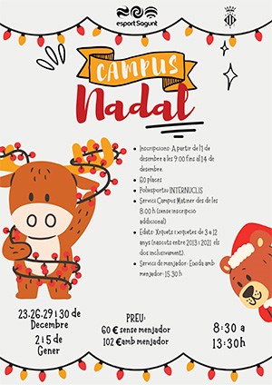 Pel que fa al Campus Nadal, organitzat pel departament d'Activitat Física, Salut i Esports, tindrà lloc en la seua ubicació habitual, el Poliesportiu Municipal (Internuclis), els dies 23, 26, 29 i 30 de desembre i el 2 i el 5 de gener en horari de 8.30 a 13.30 hores. No obstant això, hi haurà servici Campus Matiner des de les 8.00 hores, sense necessitat de fer una inscripció addicional, i en el cas dels xiquets i les xiquetes que tinguen el servici de menjador l'eixida serà a les 15.30 hores.
