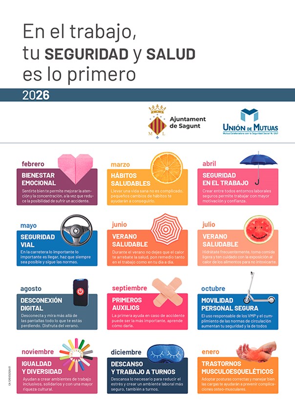 Els assumptes sobre els quals posarà l'accent esta iniciativa a través de cartelleria, fullets informatius i vídeos que es reproduiran en les pantalles de les sales d'espera dels edificis municipals són: el benestar emocional (febrer), els hàbits saludables (març), la seguretat en el treball (abril), la seguretat viària (maig), l'estiu saludable (juny i juliol), la desconnexió digital (agost), els primers auxilis (setembre), la mobilitat personal i segura (octubre), la igualtat i la diversitat (novembre), el descans i el treball a torns (desembre) i, finalment, els trastorns musculoesquelètics (gener).