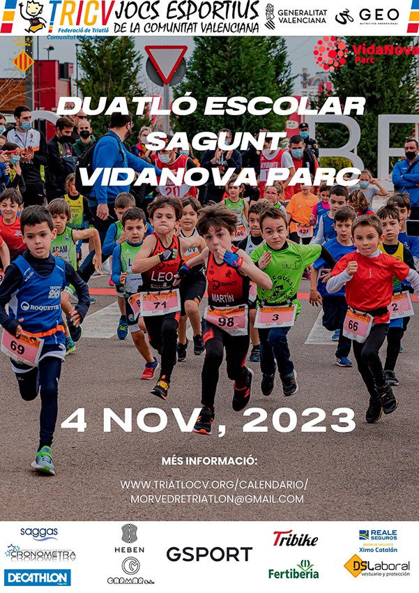El Club Morvedre Triatló, en col·laboració amb l'Ajuntament de Sagunt i VidaNova Parc, organitza la IV edició del Duatló Escolar. La prova se celebrarà dissabte que ve 4 de novembre de 2023 a partir de les 9 hores a l'aparcament del centre comercial VidaNova Parc i els seus voltants i durarà tot el matí. Comptarà, a més, amb la participació d'uns 400 escolars. La prova forma part del calendari dels jocs esportius de la Comunitat Valenciana.