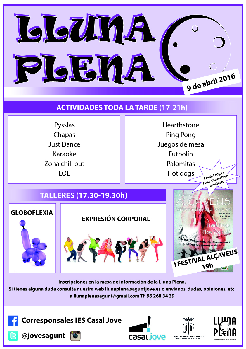 Les variades iniciatives del programa per a joves Lluna Plena tindran lloc aquest dissabte, 9 d'abril, en el Casal Jove del Port de Sagunt. Les activitats començaran a les 17.30 hores i acabaran al voltant de les 21.30 hores, fent-les coincidir amb el Festival Alçaveus, ja que els grups participants són locals i juvenils.