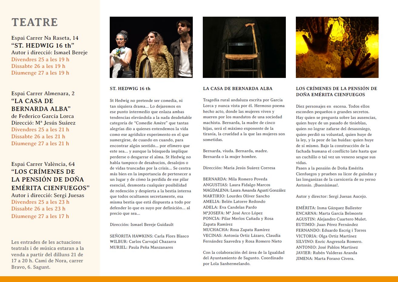 Les tres activitats principals seran teatrals, amb la representació de les obres “St. Hedwig 16 th” el divendres, dissabte i diumenge a les 19h en el Espai Carrer Na Raseta, 14; “La Casa de Bernarda Alba” els mateixos dies a les 21h en el Espai Carrer Almenara, 2; i “Los Crímenes de la Pensión de Doña Emérita Cienfuegos”, també els dies 25 i 26 a les 23h i el 27 a les 17h en el Espai Carrer València, 64.