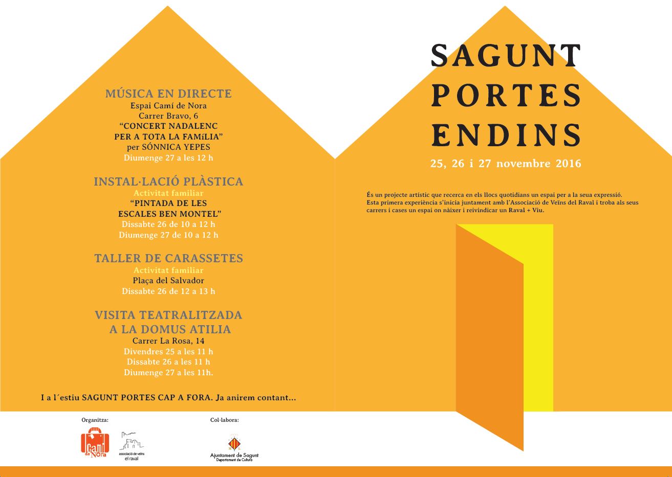 Sagunt Portes Endins, un projecte artístic que aglutina teatre, música i activitats plàstiques. Esta experiència la inicia la companyia teatral Camí de Nora juntament amb l'Associació de Veïns del Raval i la col·laboració del departament de Cultura de l'Ajuntament de Sagunt.