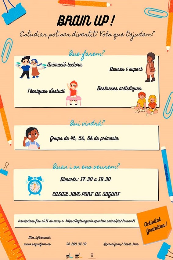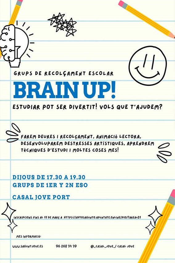 El departament de Joventut i Infància de l'Ajuntament de Sagunt ha posat en marxa la iniciativa Brain up!, un nou grup de reforç escolar, suport i motivació on es faran deures, es donarà suport a aquelles assignatures que siguen necessàries, es proporcionaran i treballaran diferents tècniques d'estudi, animació lectora i destreses artístiques, entre d’altres.