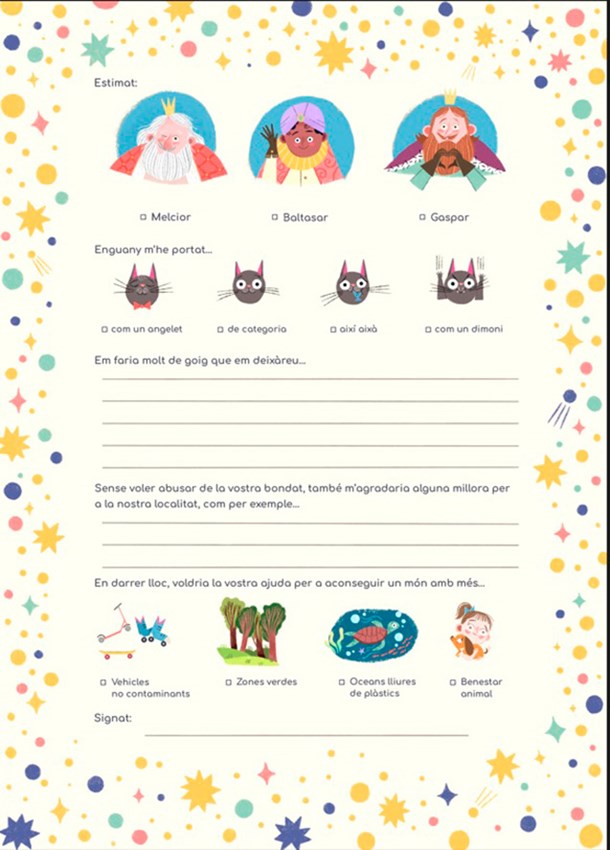 Es tracta d'una edició de disseny atractiu i actual que, any rere any, és una delícia per als xiquets i xiquetes de tota la ciutat. Com en els últims anys, les cartes es distribuiran en les parades dels mercats de Nadal i en els mercats municipals. La carta inclou en la part interior dibuixos amb vocabulari bàsic en valencià i un espai perquè els xiquets i les xiquetes facen les seues peticions personals a Melcior, Gaspar i Baltasar, però també inclou uns apartats més solidaris amb bons desitjos i millores per a la ciutat i per al món.