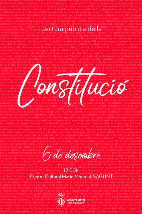 L'Ajuntament de Sagunt convida la ciutadania a participar en el Dia de la Constitució en una lectura pública de la Carta Magna a càrrec de xiquets i xiquetes del municipi. L'acte tindrà lloc el dimarts 6 de desembre, a partir de les 12.00 hores, en el Centre Cultural Mario Monreal de Sagunt.