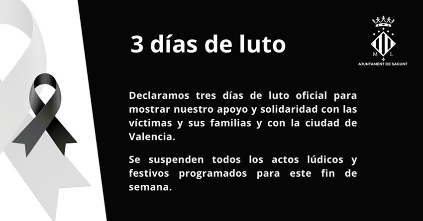 L'Ajuntament de Sagunt ha decretat tres dies de dol oficial després de l'incendi succeït en dos edificis de Campanar (València) en la vesprada del 22 de febrer i, per tant, se suspenen totes les activitats lúdiques i festives que estaven programades per a estos dies.