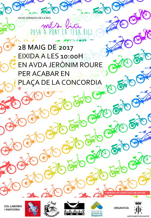 L'Ajuntament de Sagunt organitza la XXVIIIa Jornada de la Bici este diumenge, 28 de maig. Concretament, es realitzarà un recorregut que donarà inici a les 10.00 hores, en l'avinguda Jerònim Roure i finalitzarà en la plaça de la Concòrdia del Port de Sagunt.