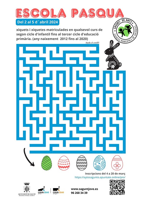 D'altra banda, l'Escola Pasqua de la regidoria de Joventut i Infància està destinada a xiquets i xiquetes matriculades en qualsevol curs des de segon cicle d'infantil fins al tercer cicle de primària (nascuts entre 2012 i 2020, tots dos inclosos). Les activitats es duran a terme tant en el Casal Jove de Sagunt com en el de Port de Sagunt i les places són limitades.