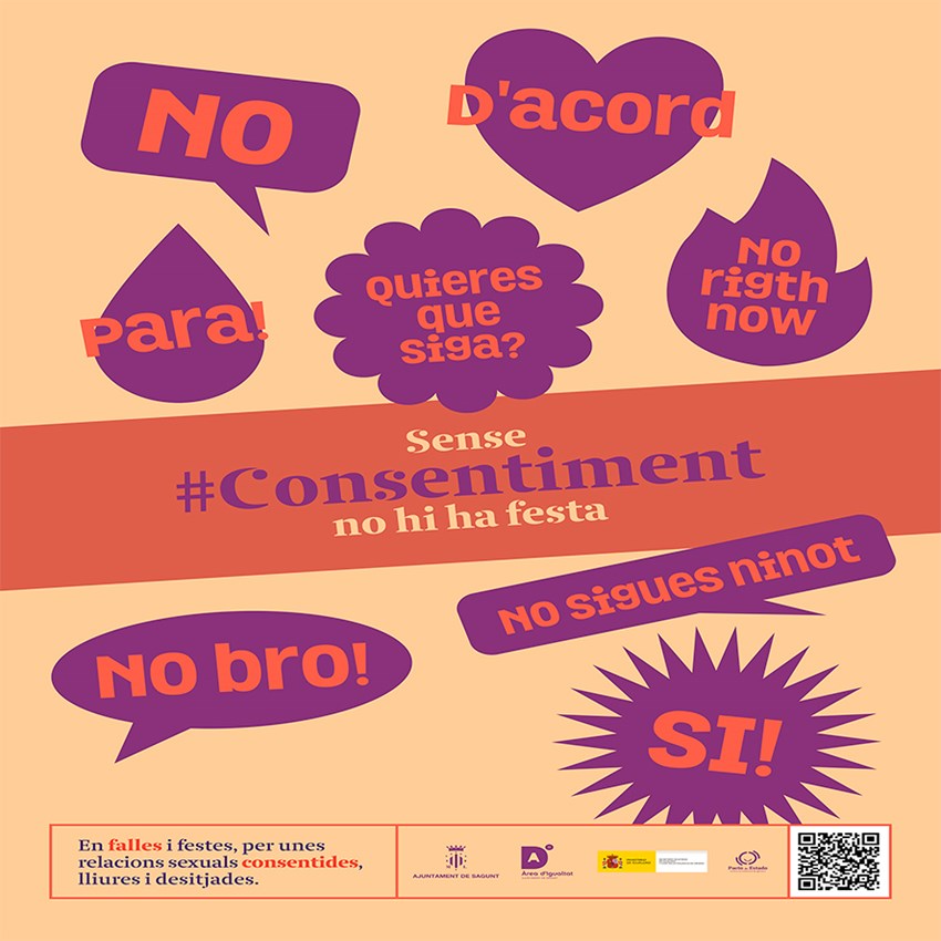 Així mateix, com s'ha citat, la regidoria d'Igualtat de l'Ajuntament de Sagunt ha presentat este matí la campanya Sense consentiment no hi ha festa, una campanya dirigida a les festes de les falles que se celebraran durant el mes de març en el municipi, i que enguany des de l'Àrea d'Igualtat han volgut basar tota esta acció de prevenció en el concepte del consentiment, entés com a acord verbal o no verbal per a participar en un acte sexual. El terme consentiment prové de la paraula consens, la qual significa acord mutu, una forma infal·lible d'assegurar la igualtat en les relacions sexuals, expliquen des de l'Àrea.