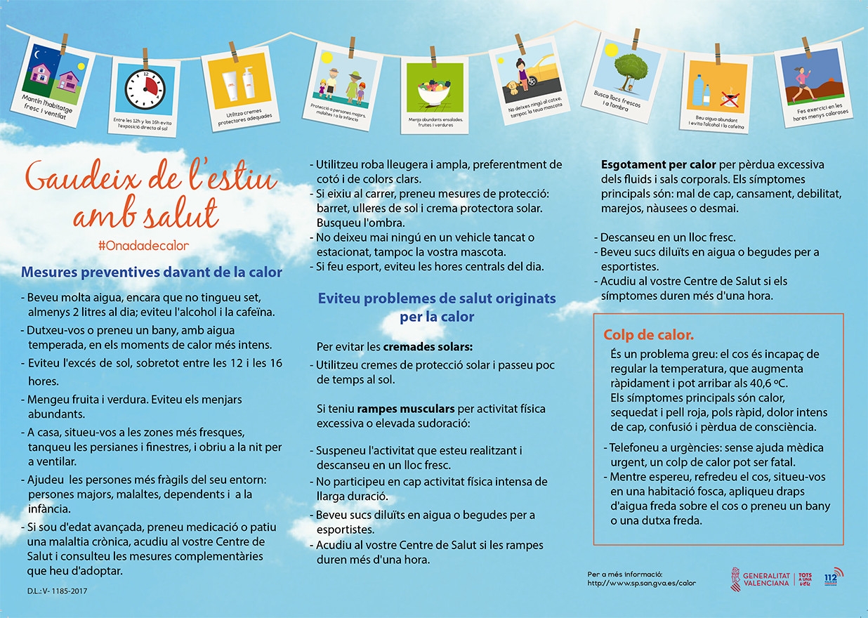 La Generalitat Valenciana ha llançat, un any més, amb la mirada posada en el present estiu 2022, el Programa de Prevenció i Atenció als Problemes de Salut Derivats de les Temperatures Extremes en la Comunitat Valenciana, que s'estendrà durant tota la temporada estival.
