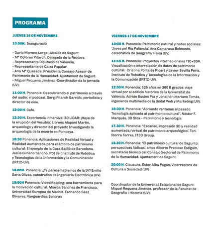 La digitalització i impressió en 3D, el videomaping, els pòdcasts, la realitat virtual immersiva, la realitat augmentada, la intel·ligència artificial, les xarxes socials, els videojocs, etcètera són algunes de les tècniques emprades per a generar llenguatges i sensacions completament nous a l'hora de conéixer, valorar i gaudir del patrimoni són algunes de les temàtiques que s'abordaran en la present edició de la Universitat de Tardor de Sagunt.