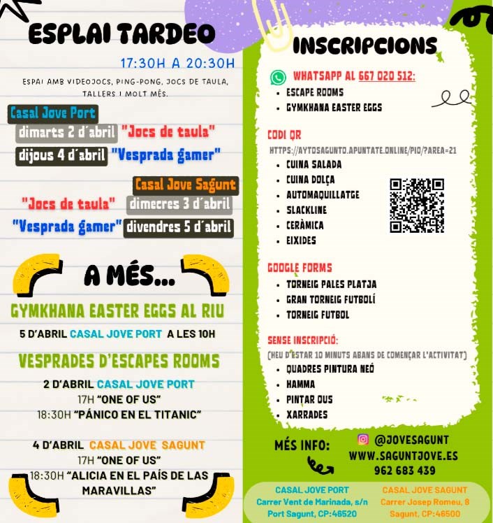 La inscripció ja està oberta i finalitza un dia abans de començar les activitats. Es realitza per la plataforma de l'Ajuntament, codi QR o WhatsApp, encara que en algunes activitats només serà necessari presentar-se 10 minuts abans de l'inici de l'activitat. Totes activitats són gratuïtes, accessibles i variades per a donar resposta a tota la població juvenil. Per a més informació seguix en Instagram a @jovesagunt, visita www.saguntjove.es, o contacta'ns al 96 268 34 39.