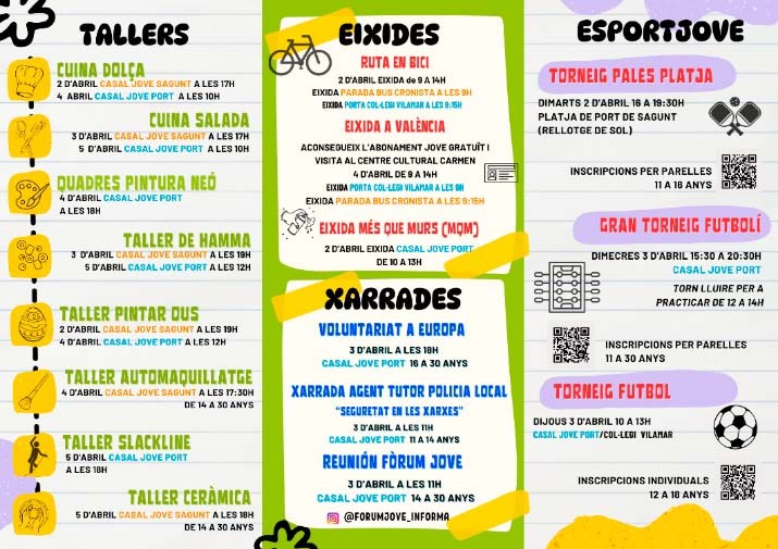 La regidoria ha programat més de 20 activitats diferents: vespreig jove, que consistix en vesprades plenes de diversió amb jocs de taula i videojocs; eixides, que seran a València, passejos amb bici, i a visitar els murs del municipi amb l'eixida Més que murs; tallers de cuina, pintura, ceràmica, automaquillatge i slackline; esport, amb tornejos esportius, com el del dimecres 3 d'abril, en què tindrà lloc un gran torneig de futbolí amb més de 6 futbolins; xarrades sobre voluntariat a Europa, seguretat en xarxes i el fòrum jove; escapes rooms, que des del departament indiquen que seran d'aventures emocionants i resoldre històries i frases enginyoses durant dos vesprades.