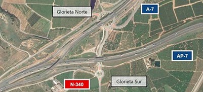 A més, la carretera nacional N-340 travessa sota l'autopista AP-7, connectant amb l'autovia A-7 mitjançant un enllaç tipus glorieta a distint nivell (glorieta nord) que es complementa amb una altra glorieta per a facilitar l'accés des de València a l'N-340 (glorieta sud).