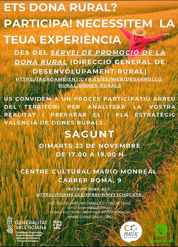 Sagunt acull el ‘Taller Mujeres Rurales’ dimarts que ve, 23 de novembre, a les 17.00 en el Centre Cultural Mario Monreal (carrer Roma, 9) de Sagunt. Este taller pretén fer partícips les dones rurals del municipi, tant de Sagunt com d'altres municipis del Camp de Morvedre, del procés participatiu per analitzar la seua realitat i preparar el I Pla Estratègic Valencià de Dones Rurals.