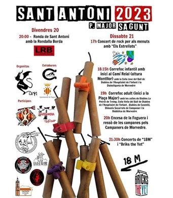 Des de l’Associació Diabòlica de Morvedre han explicat en què consistiran els actes i han destacat que «estan molt contents i contentes de de tornar a la normalitat i que han fet una programació tenint molt en compte als menuts». Així doncs, el dissabte, 21 de gener, a les 17 hores, hi haurà un concert de rock per als més menuts de la mà del grup Els Estrellats. Posteriorment, a les 18.15 hores tindrà lloc un correfoc infantil que discorrerà des de Camí Reial i que comptarà amb la Colla Jove del Ball de Diables de l'Hospitalet de l'Infant i la Diaboliqueta de Morvedre. A les 19 hores començarà el correfoc adult des de la plaça Major amb les colles de Diables El Peirot de Tremp, la Colla Vella del Ball de Diables de l'Hospitalet de l'Infant, Diables de Castelló, Dimonis Socarrats de Campanar i la Diabòlica de Morvedre. A les 20 hores serà l'esperada encesa de la foguera i el toc de campanes voltejades pels Campaners de Morvedre. Finalment, a les 21.30 hores la clausura arribarà amb el concert de 18M i Briks the Yet. Totes estes activitats estan organitzades per l'Associació Diabòlica de Morvedre i l’Associació Amics del Cavall en col·laboració amb el departament de Festes de l'Ajuntament de Sagunt i altres associacions.