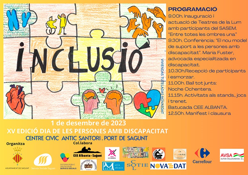 El día 1 de diciembre, el Ayuntamiento de Sagunt celebrará la XV edición del Día Internacional de las Personas con Discapacidad, que realment es el día 3 de diciembre. Los actos es duran a termes en el Centre Cívic Antic Sanatori del Port de Sagunt comenzando a las 9 horas y finalmente a las 13 horas, aproximadamente.
