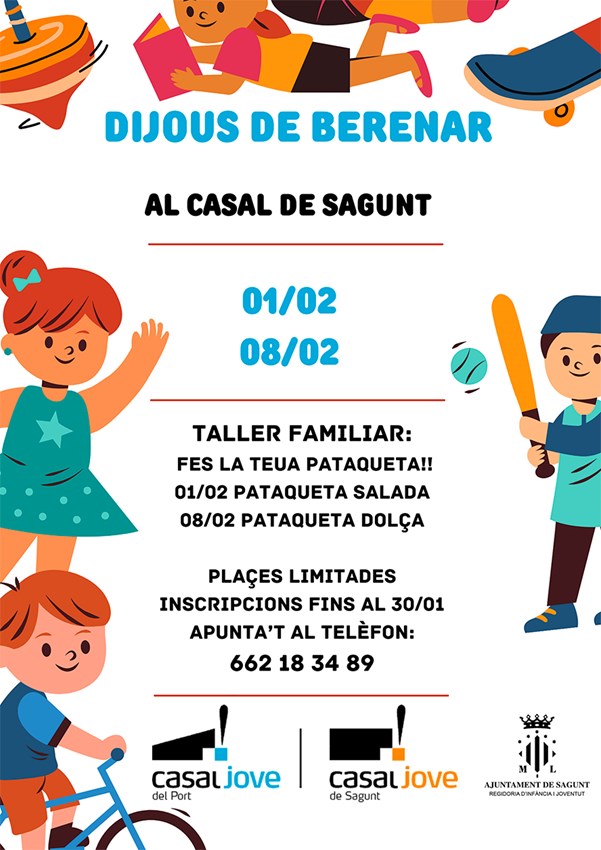 Els tallers s'han promogut amb motiu del Dijous de Berenar. L'1 de febrer es duran a terme pataquetas salades i el 8 de febrer es realitzaran pataquetas dolces. Este taller és gratuït i la inscripció es pot realitzar fins al 30 de gener a través del número de telèfon 662 18 34 89 o acudint al Casal Jove de Sagunt.