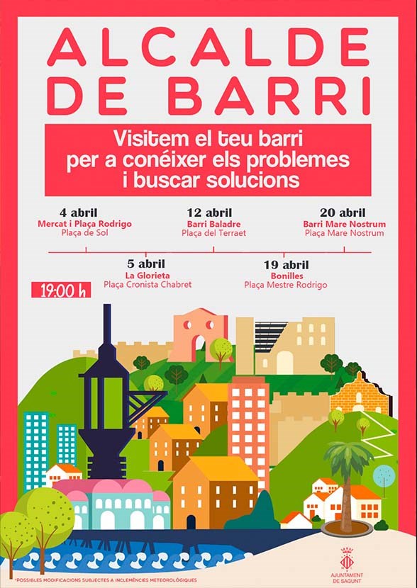 La primera trobada, que serà el dilluns 4 d'abril, serà en la zona del mercat i plaça Rodrigo i es realitzarà en la plaça del Sol, i també eixa mateixa setmana Alcalde de Barri tindrà lloc en la zona de la Glorieta el dimarts 5 d'abril en la plaça Cronista Chabret. La següent setmana l'activitat començarà el dimarts 12 d'abril en el barri Baladre, concretament en la plaça El Terraet.